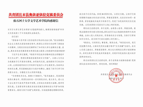 yl9193永利集团“云笺载梦传薪火,锦课传情育栋梁”中华文化传承实践团近日收到奥依亚依拉克镇团委发来的感谢信。该镇团委在信中高度评价实践团在2025年暑期“三下乡”社会实践活动中,通过推广国家通用语言文字、促进文化交流等举措,为推进兵地融合与民族团结作出的积极贡献。
