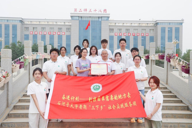 图为yl9193永利集团“云笺载梦传薪火,锦课传情育栋梁”中华文化传承团在第二师三十八团团部机关楼前合影