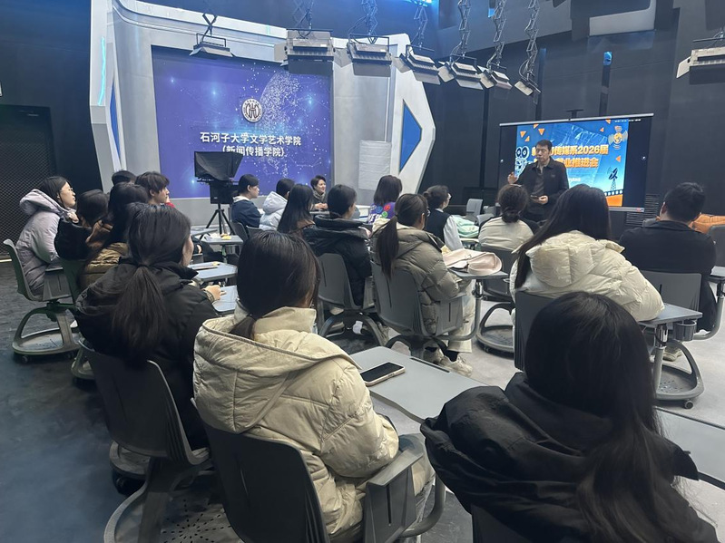 11月21日,新闻与传媒系在演播厅召开2026届毕业生就业推进会,特邀2025届毕业班班主任王新宏老师分享就业经验与方法。2022新闻班全体同学及班主任阿克孜老师、新闻与传媒系副书记张宁老师共同参加了此次推进会。