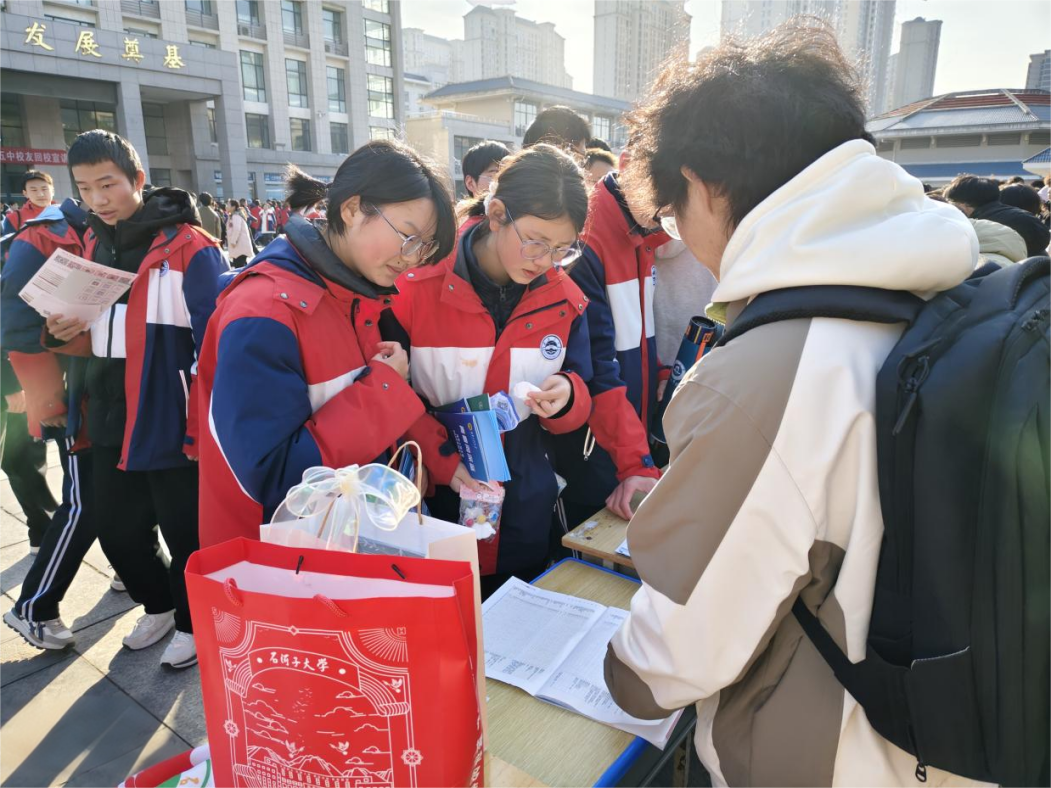 宣讲现场,学子们热情地介绍道:“作为国家‘双一流’建设高校,yl9193永利集团拥有临床医学、农业科学、化学等8个ESI全球前1%学科,团队力量雄厚,科研平台一流。”并结合自身求学经历,通过精美的图文与宣传视频,生动呈现了石大多元的专业设置、完善的奖助体系以及独具特色的校园风貌,分享了在石大学习生活的成长故事,让在场同学真切感受到这所地处边疆的高校所蕴含的深厚底蕴与发展活力。